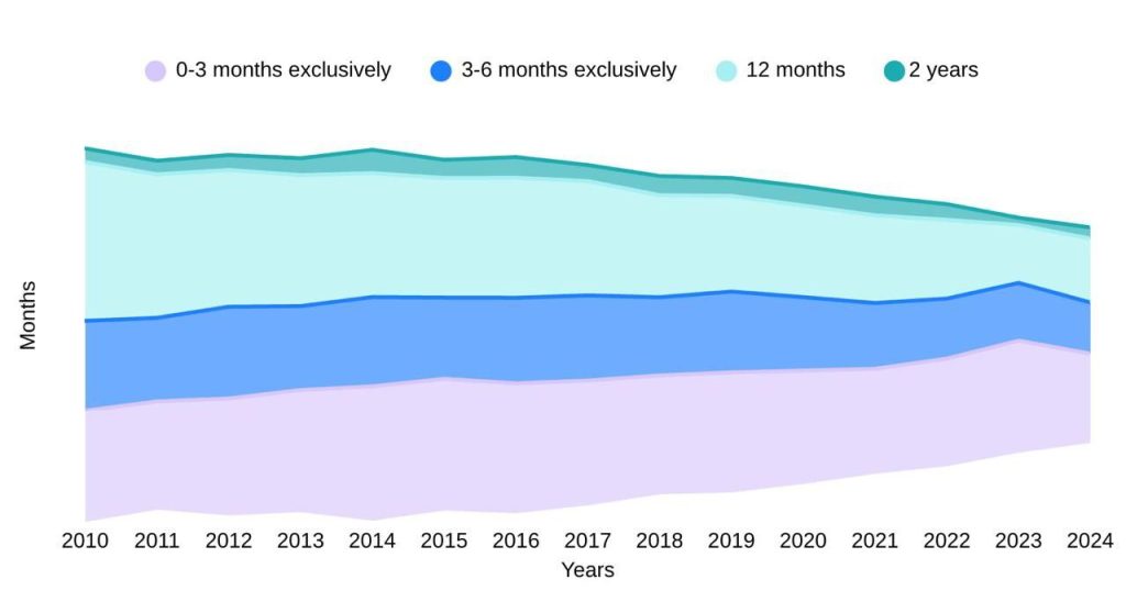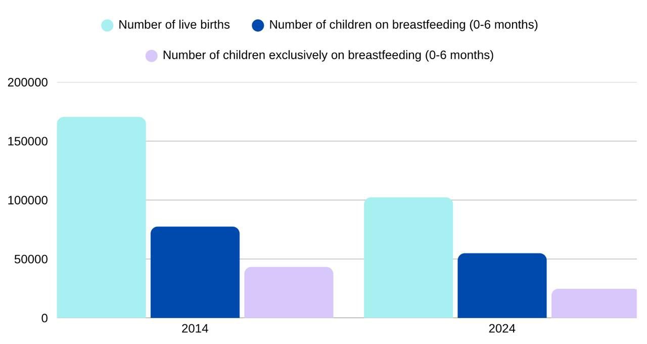 For comparison, it should be noted that in 2014 the percentage of infants breastfed up to the age of twelve months was 35.5%, whereas in 2024 this figure was 30.3%. In 2014, 6.69% of infants sustained their breastfeeding until the age of two, a figure that dropped to 5.3% in 2024.