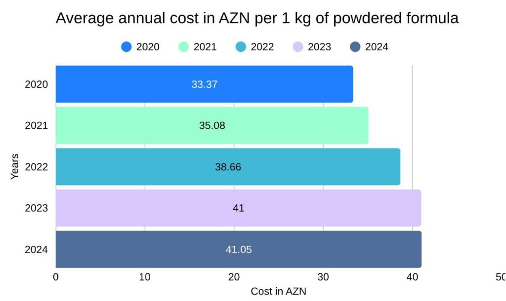 In Azerbaijan, due to the absence of local production of infant formula, prices are determined based on the brand of the formula as well as import and logistics costs. While the price per kilogram of powdered infant formula was 33.37 AZN in 2020, it reached 41.5 AZN in 2024. Over the past four years, the price of infant formula increased by 18.50%. This increase corresponds to the price growth observed in the infant food market in the United Kingdom. In the local market, the increase in the price of infant formula over the last four years corresponds to approximately 7.68 AZN per kilogram. This figure also aligns with the increase in the U.S. market for infant formula over the past four years, which is approximately USD 4.48 (7.06 AZN at the current exchange rate).