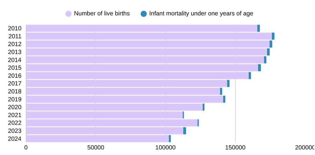 Despite the decline in the number of live births, a year-by-year decrease is observed in the proportion of infants who die before the age of one relative to the number of live births. This positive development may be associated with advances in medicine and improvements in the quality of neonatal care. Thus, infants who, on a global scale in previous years, would have died due to the low level of neonatal care now have higher chances of survival under contemporary conditions.